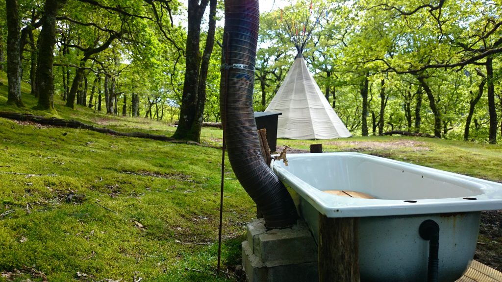 All of our tipis and yurts now have their own wood-fired bath just outside. Light the fire in the stove underneath and in about an hour and a half (quicker